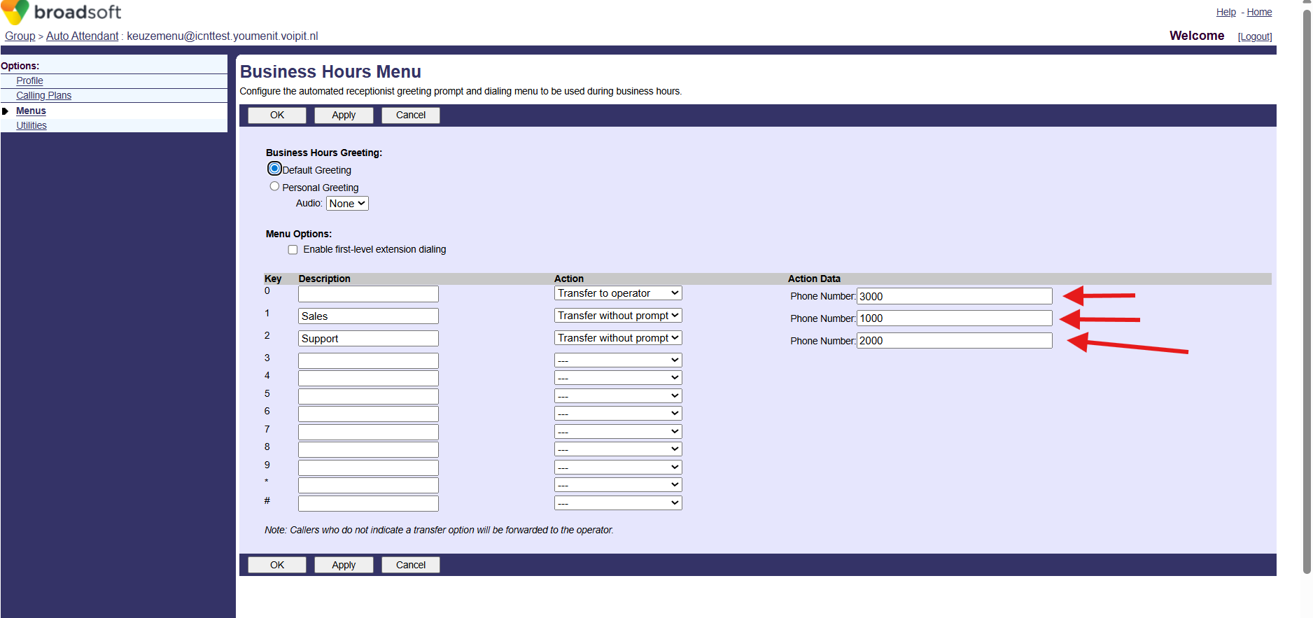 *When creating Menus based on needs, it's important to have in mind that before that happend we should have a Hount Group or Call Center created with the correct ID/Extension (e.g: 3000,1000,2000) so we can re-direct the call to the right Person/Group.